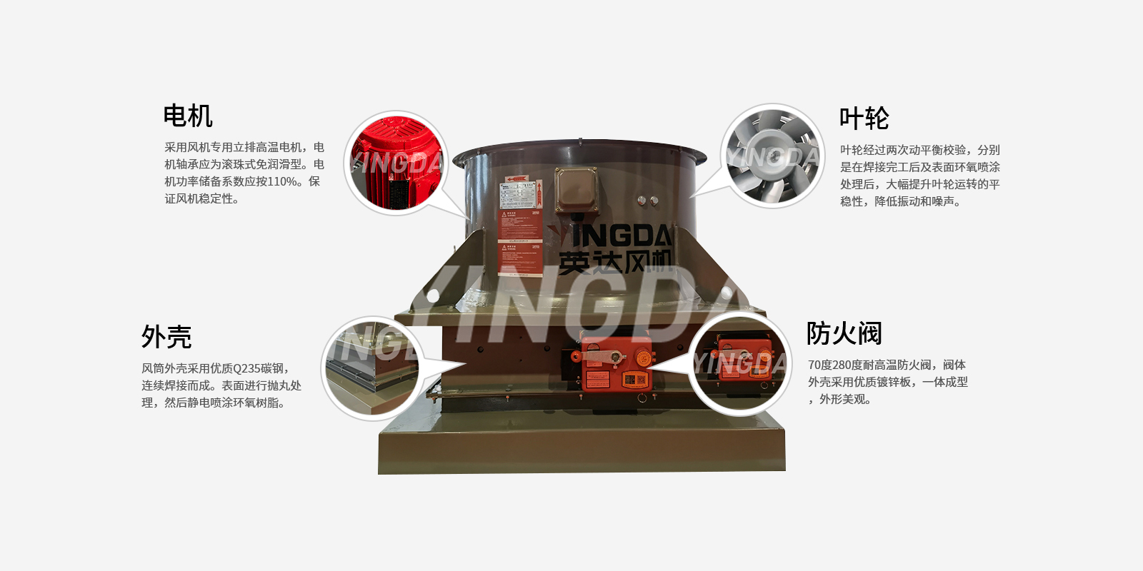 1.1.DWT(HTF)型軸管廊消防排煙,其基本形式為軸流屋頂式結(jié)構(gòu),電機(jī)采用耐高溫電機(jī),產(chǎn)品按GA211-2009《消防排煙風(fēng)機(jī)耐高溫試驗(yàn)方法》進(jìn)行耐高溫試驗(yàn),通過(guò)公安部消防產(chǎn)品合格評(píng)定中心3C強(qiáng)制性認(rèn)證,可在介質(zhì)溫度280℃。高溫條件下連續(xù)運(yùn)轉(zhuǎn)30分鐘以上,100℃溫度條件下連續(xù)20小時(shí)/次不損壞,可通風(fēng)排煙兩用。